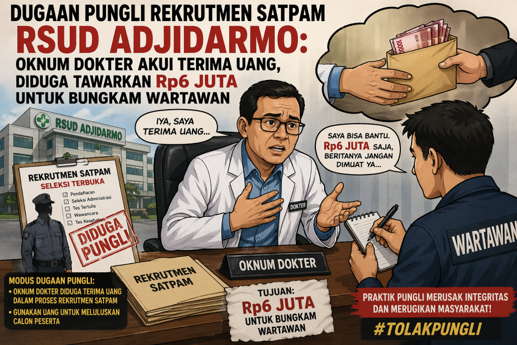 Lebak – Dugaan praktik pungutan liar (pungli) dalam proses rekrutmen tenaga satuan pengamanan (satpam) di RSUD Adjidarmo Rangkasbitung kian menguat. Seorang oknum tenaga medis berinisial “J” disebut tidak hanya mengakui menerima uang dari calon pelamar, tetapi juga diduga sempat menawarkan sejumlah uang kepada wartawan agar kasus tersebut tidak dipublikasikan. Kamis, (23/04/2026).