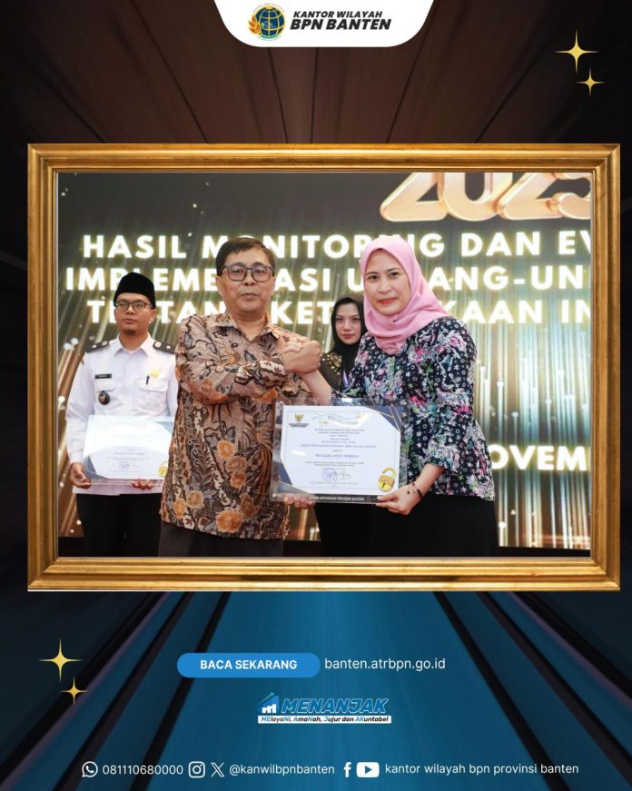 TM Serang — Kantor Wilayah Badan Pertanahan Nasional (BPN) Provinsi Banten meraih predikat Badan Publik Informatif pada ajang Penganugerahan Keterbukaan Informasi Publik Tahun 2025 yang diselenggarakan oleh Komisi Informasi Provinsi Banten.