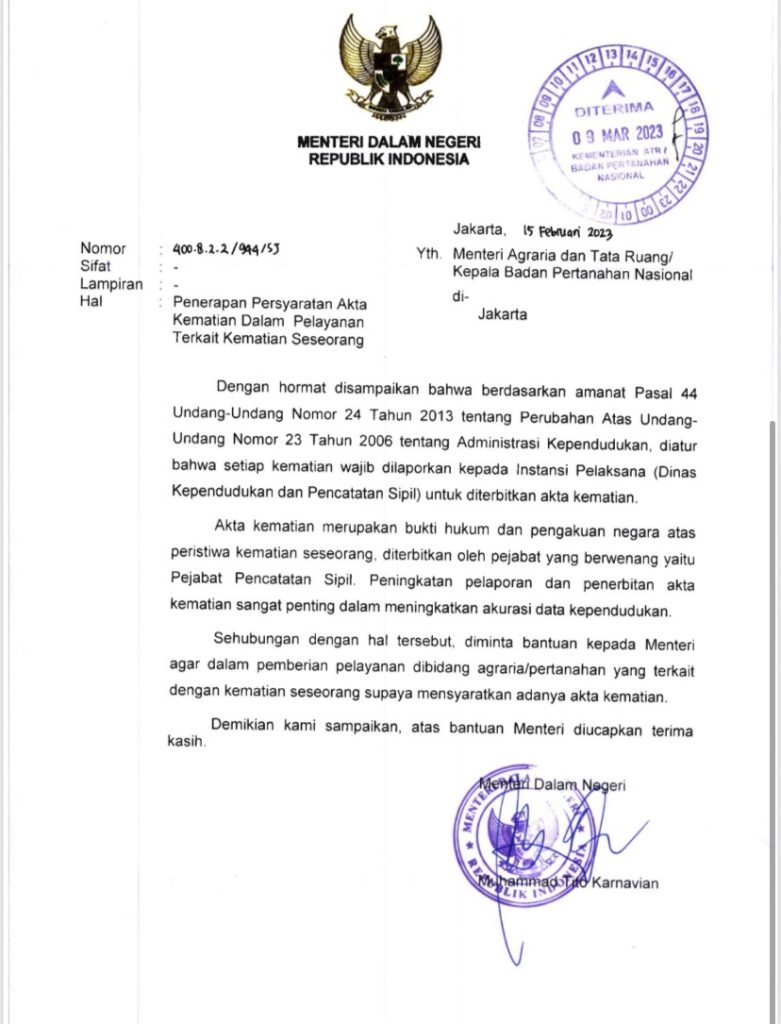 “Untuk pengurusan waris, masyarakat dapat menggunakan akta waris, surat keterangan waris, maupun dokumen waris yang ditetapkan pemerintah daerah. Jika tidak ada bentuk baku dari pemerintah daerah, maka dapat mengacu pada penetapan pengadilan atau surat keterangan waris di bawah tangan,” jelasnya.