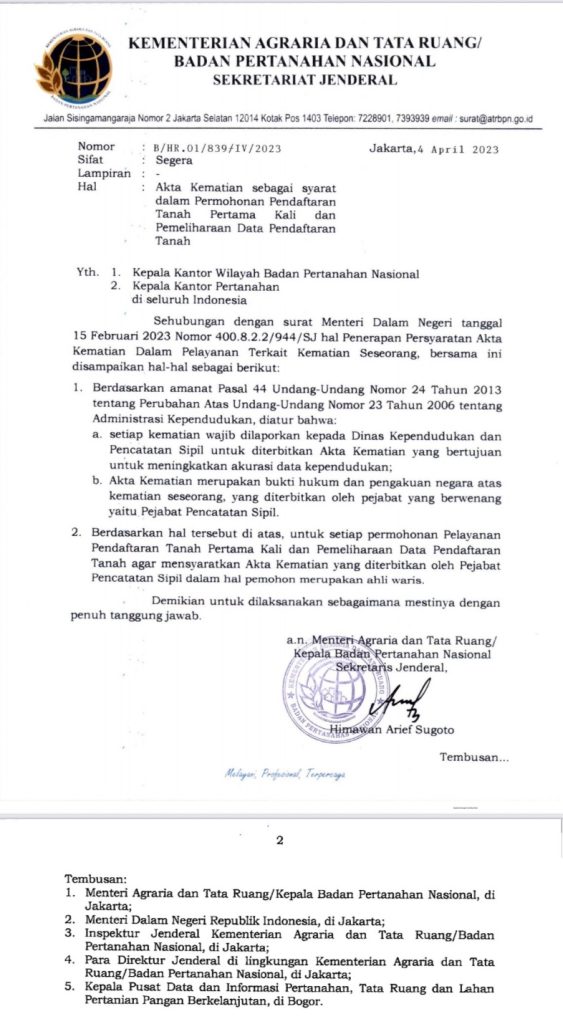 ATR/BPN berkomitmen terus meningkatkan kualitas pelayanan yang profesional, transparan, dan akuntabel, guna memberikan kemudahan serta kepastian hukum bagi masyarakat dalam mengurus hak atas tanah, khususnya melalui mekanisme waris. (Ben)