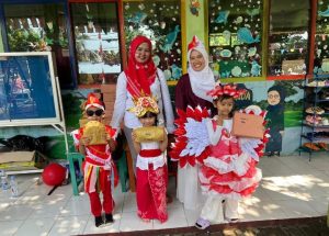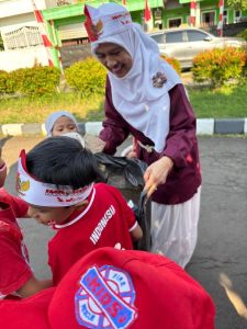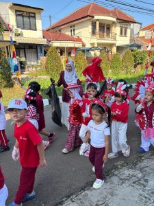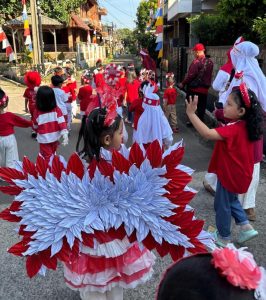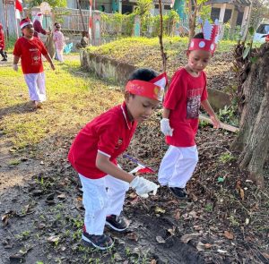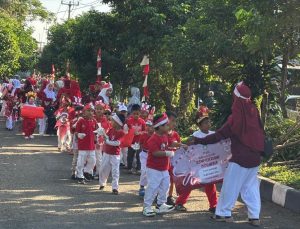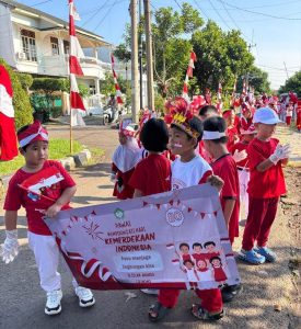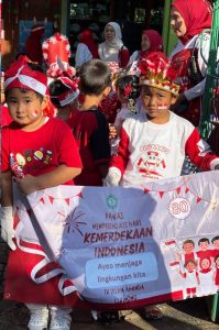 Para murid TK Islam Ananda Cibinong tampak semangat menjalankan kegiatan pawai dengan aksi bersih-bersih sampah di perayaan Hut RI Ke-80. (Foto/RDI)