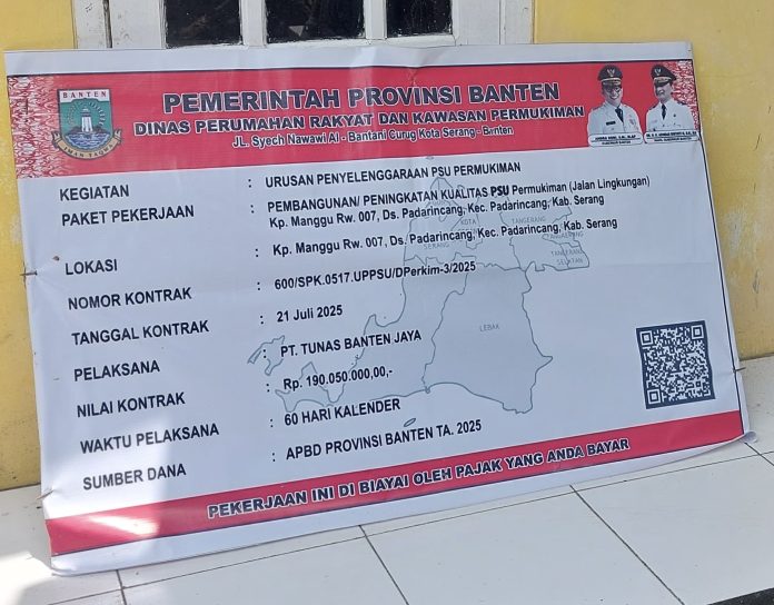 Berdasarkan data di papan informasi proyek, pekerjaan tersebut dilaksanakan oleh PT Tunas Banten Jaya dengan nilai kontrak sebesar Rp190.050.000, bersumber dari APBD Provinsi Banten Tahun Anggaran 2025. Proyek dimulai berdasarkan kontrak tertanggal 21 Juli 2025 dengan waktu pelaksanaan 60 hari kalender.