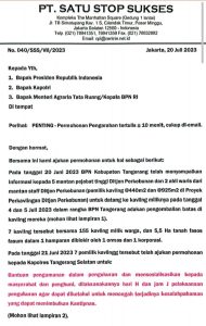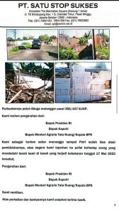 Surat terbuka PT Satu Stop Sukses (PT.SSS) kepada Presiden RI dan Kapolri terkait sulitnya menguasai lahan miliknya di Kavling ditjend perkebunan Tangerang, sebagai salah satu contoh persoalan sengketa lahan yang patut mendapat perhatian dari Kementrian ATR/BPN. (Foto/TM)